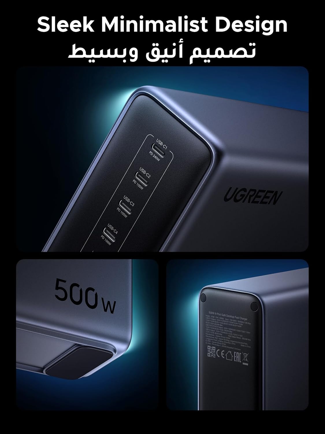 Charge your device with the total 500W power! This premium GaN station 6 devices (laptops, tablets, phones...) simultaneously via 5*USB-C and 1*USB-A. Perfect for Middle Eastern homes/offices using multiple Apple and Android devices simultaneously.
