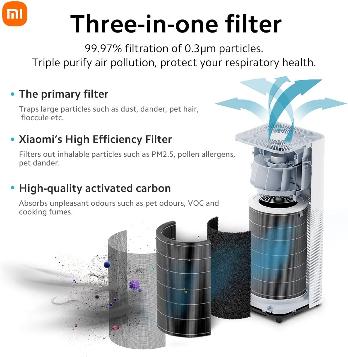 Xiaomi Smart Air Purifier 4 Pro features real-time sensitive monitoring, powerful purification and smart control. It can quickly purify the air in the living room and bedroom, and the effective coverage area is up to 104m² (2ACPH) . The PM2.5 / PM10 dual-effect sensor of Xiaomi Smart Air Purifier 4 Pro can sensitively capture the air quality changes of air pollutants, such as pollen, spores, dust and dander that cannot be seen in the air, and the air-quality data can be shown on the OLED display in real time. Xiaomi Smart Air Purifier 4 Pro adopts three-in-one and long-acting performance filter. The three-in-one filter design makes the air purifier can filter out 99.97% of 0.3 μm particles. The long-acting filter performance means less replacements, with one filter lasting 6-12 months. Xiaomi Smart Air Purifier 4 Pro also has negative-ion generator to generate negative air ionization, which can enhance air purification with dust cleaning, making you feel as though you’re in the forest. In additional, the air purifier supports smart control, it can be remotely controlled and get filter replacement reminder through Xiaomi App, and can also support voice control through Google Assistant and Alexa.