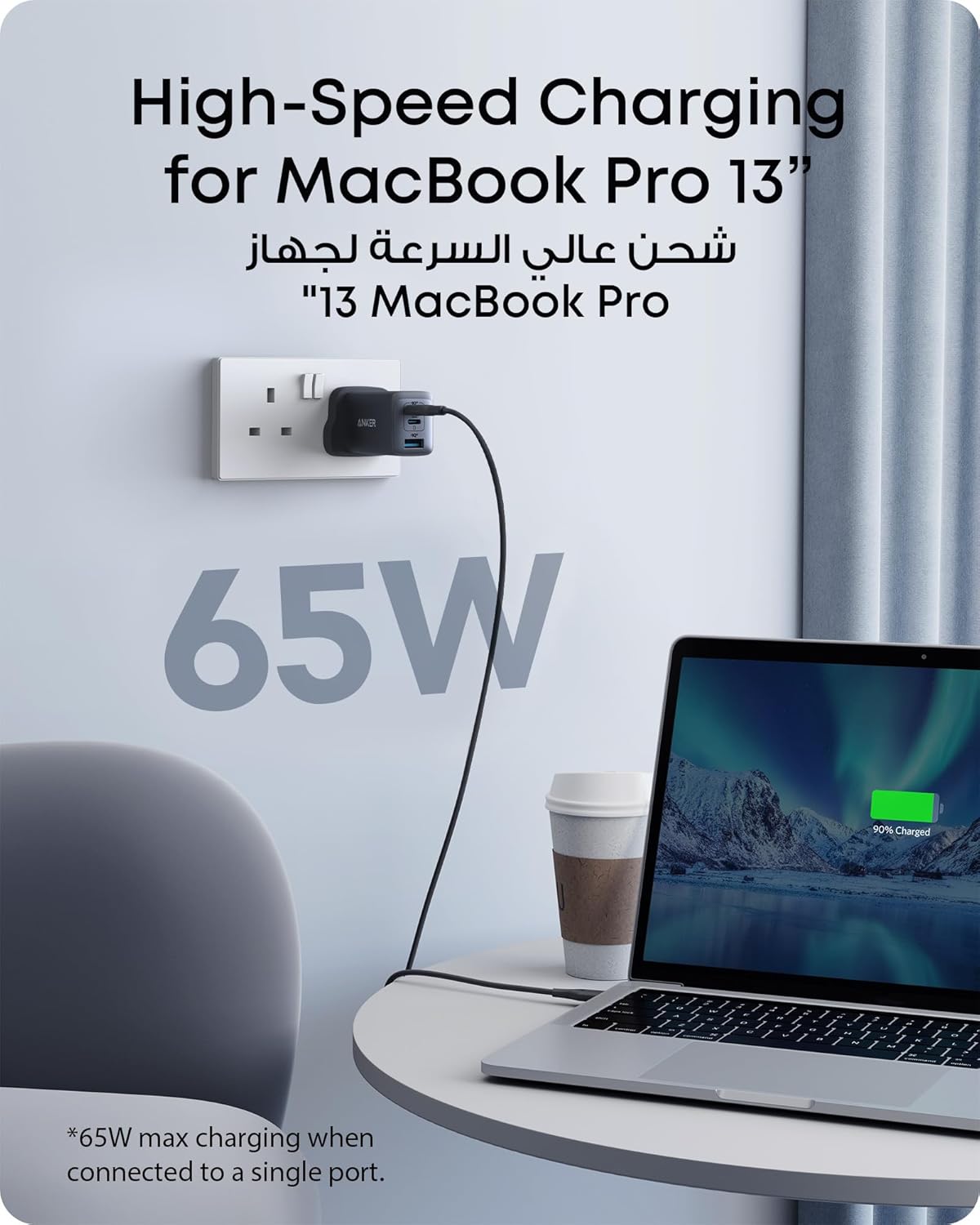 - High-Speed Charging: Connect a single device to get a 65W max charge—that’s enough to power up a 2020 MacBook Pro 13″ at full speed. And when you connect three devices, power will be distributed efficiently between ports to ensure you get the best charge.