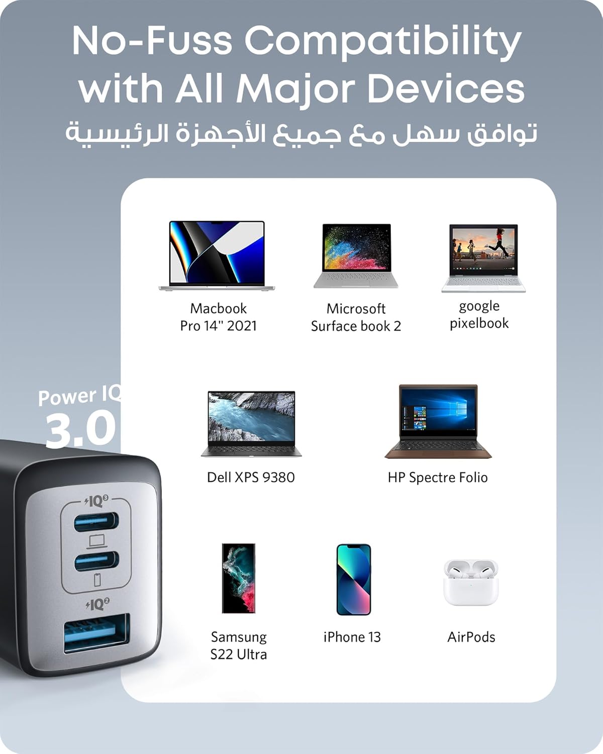 - What You Get: Anker 735 Charger (Nano II 65W) / PowerPort III 3-Port 65W Pod, welcome guide, our worry-free 12-month warranty, and friendly customer service.