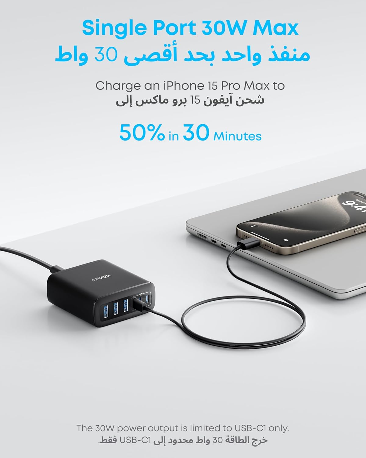 - Maximum Power, Minimum Time: Efficiently power your MacBook Air to 50% in just 1 hour 40 minutes or quickly boost your iPhone 16 Pro Max from 0 - 50% in 30 minutes with a single 30W max charging port.