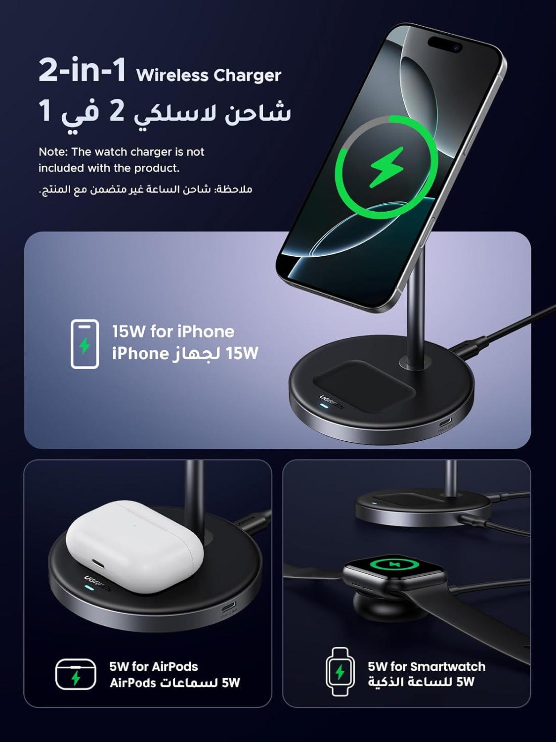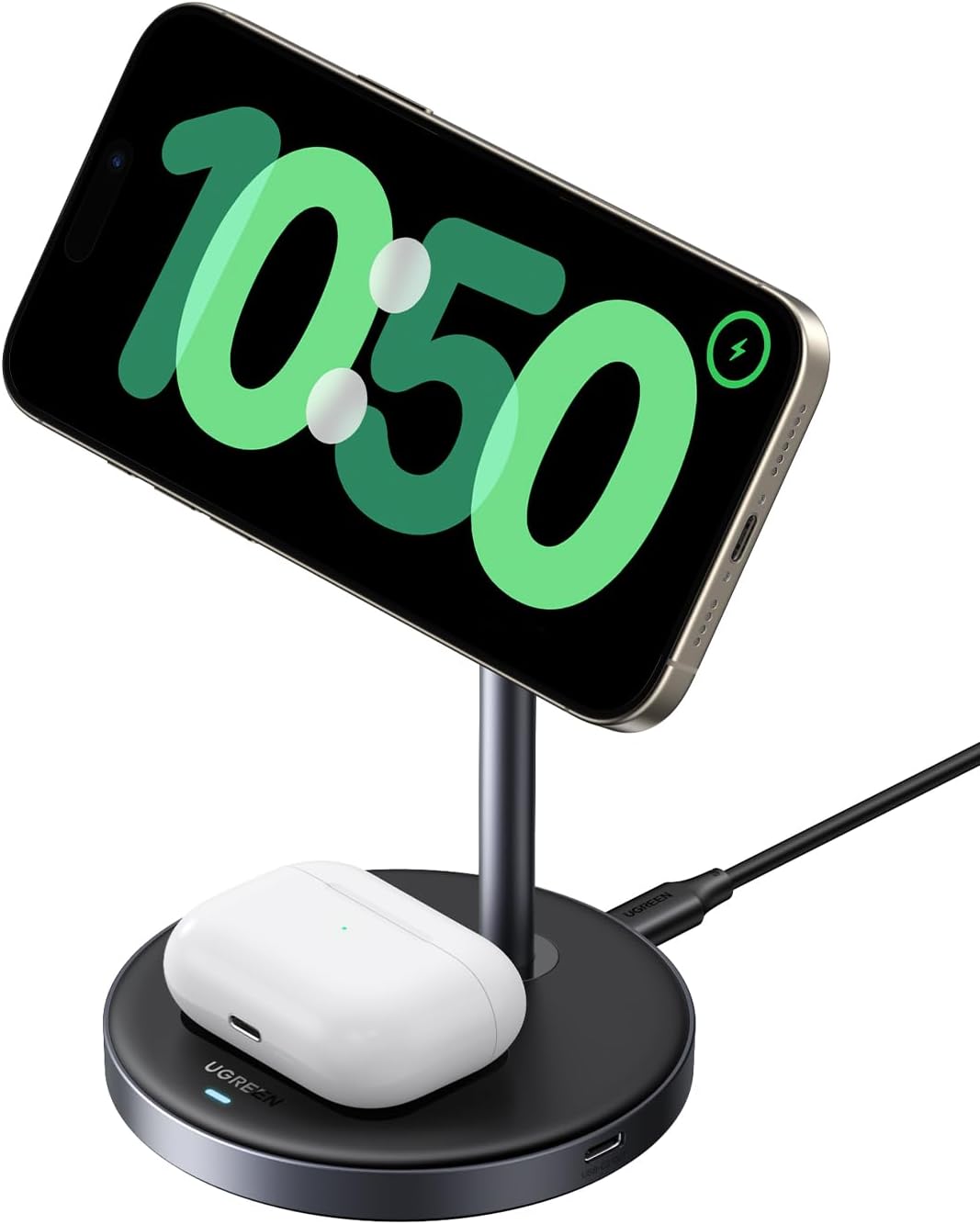 UGREEN MagFlow Qi2 Wireless Charger 15W, 2 in 1 Magsafe iPhone Charger Magnetic Stand Airpods Wireless 15W Fast Charging Station 360° Free Rotation for iPhone 17-12 series, AirPods Pro 4/3/2