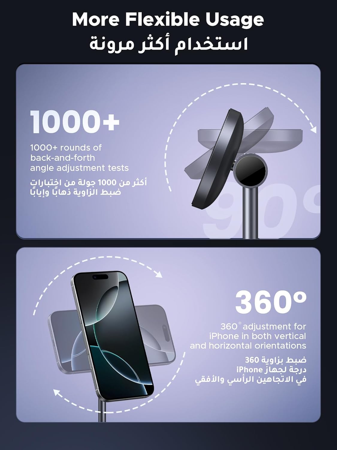 Free charge your iPhone in either 90° or 360° rotation. You can adjust your iPhone vertically or horizontally to maintain the perfect viewing angle when watching videos or viewing messages.