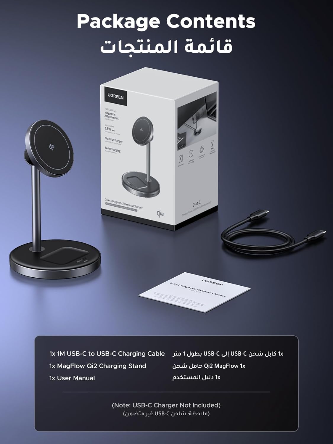 1 * UGREEN 2-in-1 Magsafe Qi2 15W Wireless Charger, 1 * 1M USB C Cable, 1 * user manual, 24-month warranty, 24-hour customer service, lifetime technical support.