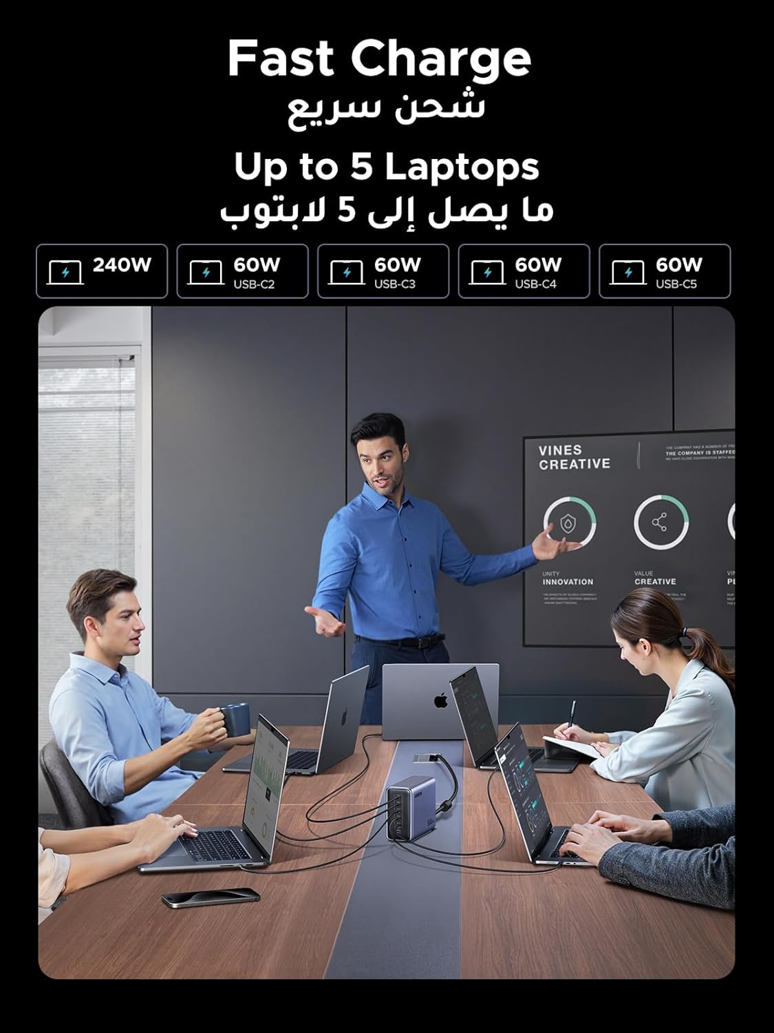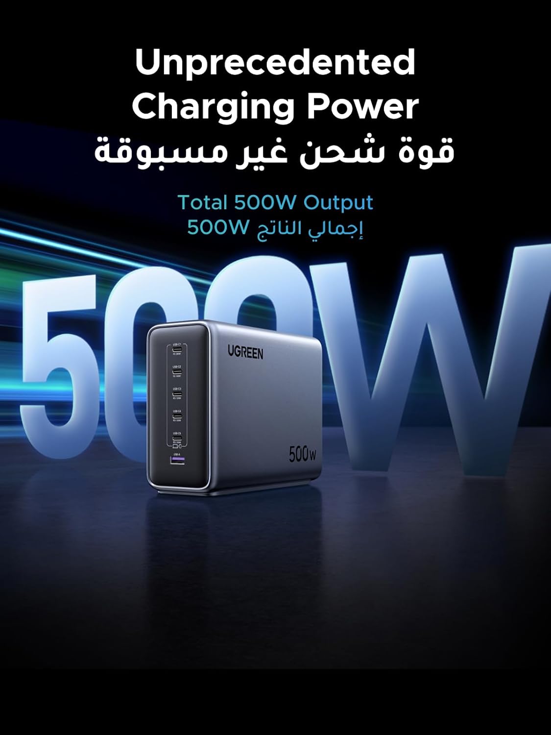 Charge your device with the total 500W power! This premium GaN station 6 devices (laptops, tablets, phones...) simultaneously via 5*USB-C and 1*USB-A. Perfect for Middle Eastern homes/offices using multiple Apple and Android devices simultaneously.