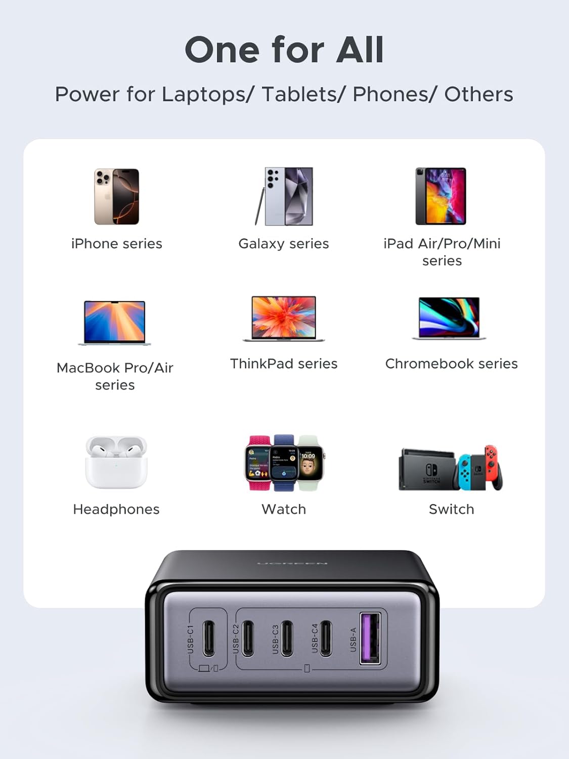 Charge your device with the total 65W power! This premium GaN station 5 devices(laptops, tablets, phones...) simultaneously via 4*USB C and 1*USB A. Perfect for Middle Eastern homes/offices using multiple Apple and Android devices simultaneously.