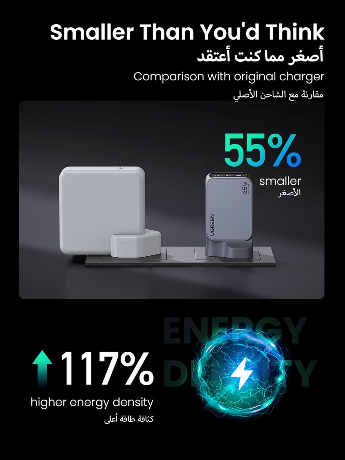 UGREEN Nexode Pro 65W USB C charger enjoys the innovative Hybrid Power Solution, which increases the power conversion rate to 95%, and provides industry-leading efficiency to avoid wasting energy and be more environmental.