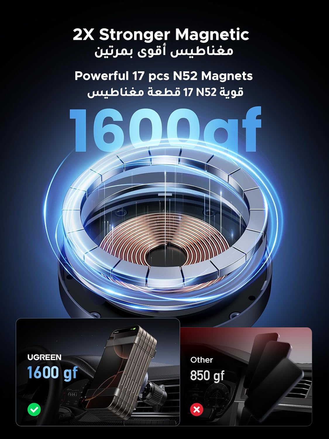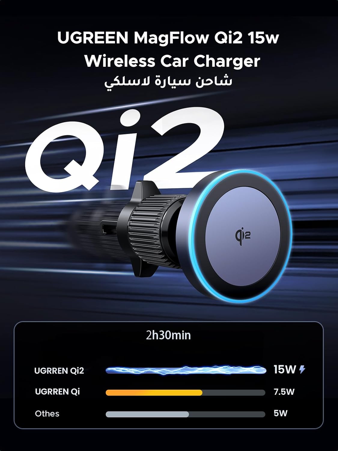 Experience lightning-speed power for your iPhone! UGREEN Qi2 wireless charger delivers 15W max output to compatible iPhones (12-17 series with iOS 17.2+/17.4+), cutting charging time by 50% vs. others. Fast wireless charger tech actively cools via car vent airflow, ensuring peak performance even in 50°C desert heat.