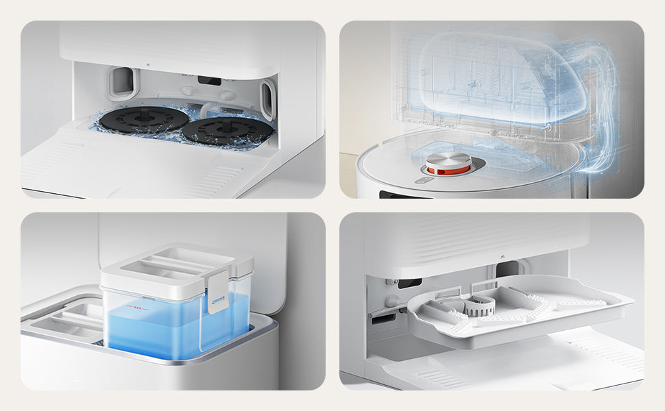 The mop pad is quickly soaked with a powerful water flow and rotated for cleaning. After the high-speed centrifugal rotary cleaning process is completed, the mop pad is automatically dried with hot air in as fast as 3 hours, with no need for sun drying, preventing mould and odours. Hands-free to enjoy effortless cleaning.