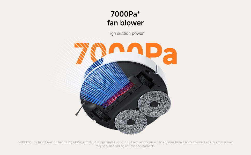 Powerful suction fan blower, Precise obstacle avoidance system with structured light and edge laser. Smart carpet detection with auto mop pad raising. The fan blower of Xiaomi Robot Vacuum X20 Pro generates up to 7000Pa of air pressure. Data comes from Xiaomi Internal Labs. Suction power may vary depending on test environments.